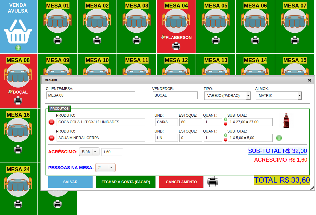 Facilite o controle de vendas do seu bar, restaurante, pizzaria. Comissão do vendedor/garçon. Divisão de conta por pessoa.